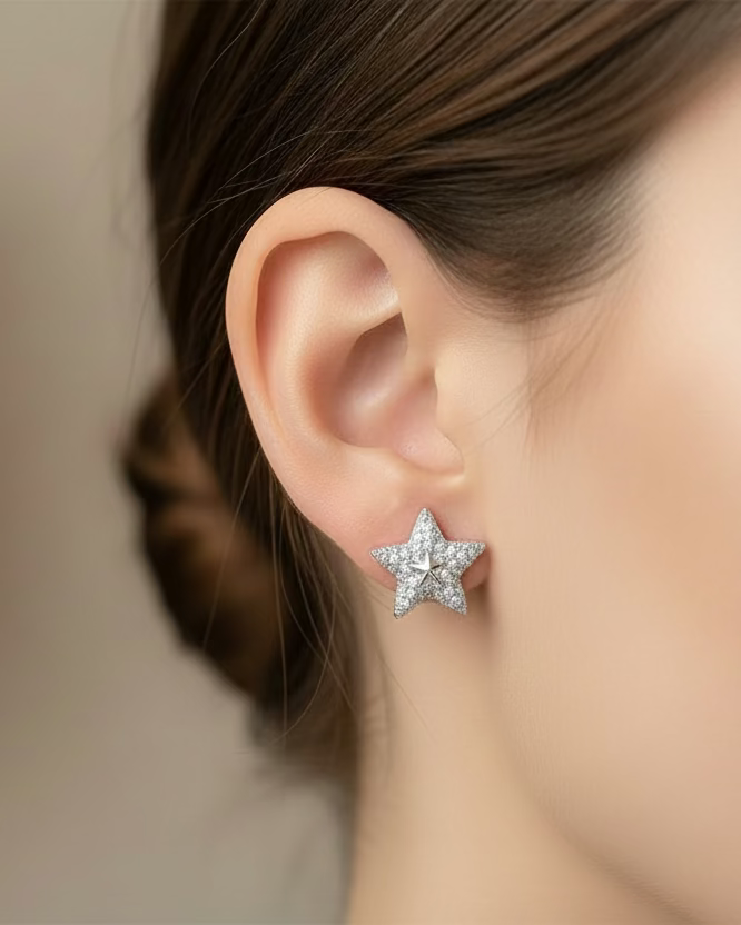 Delicate star-shaped huggies adorned with sparkling diamante crystals. Crafted with 14k coated silver hardware and sterling silver 925 studs, these earrings combine elegance with comfort. The hypoallergenic sterling silver construction makes them ideal for sensitive skin, allowing you to wear them all day without irritation. Perfect for adding a touch of celestial charm to any look. Also available in Gold.