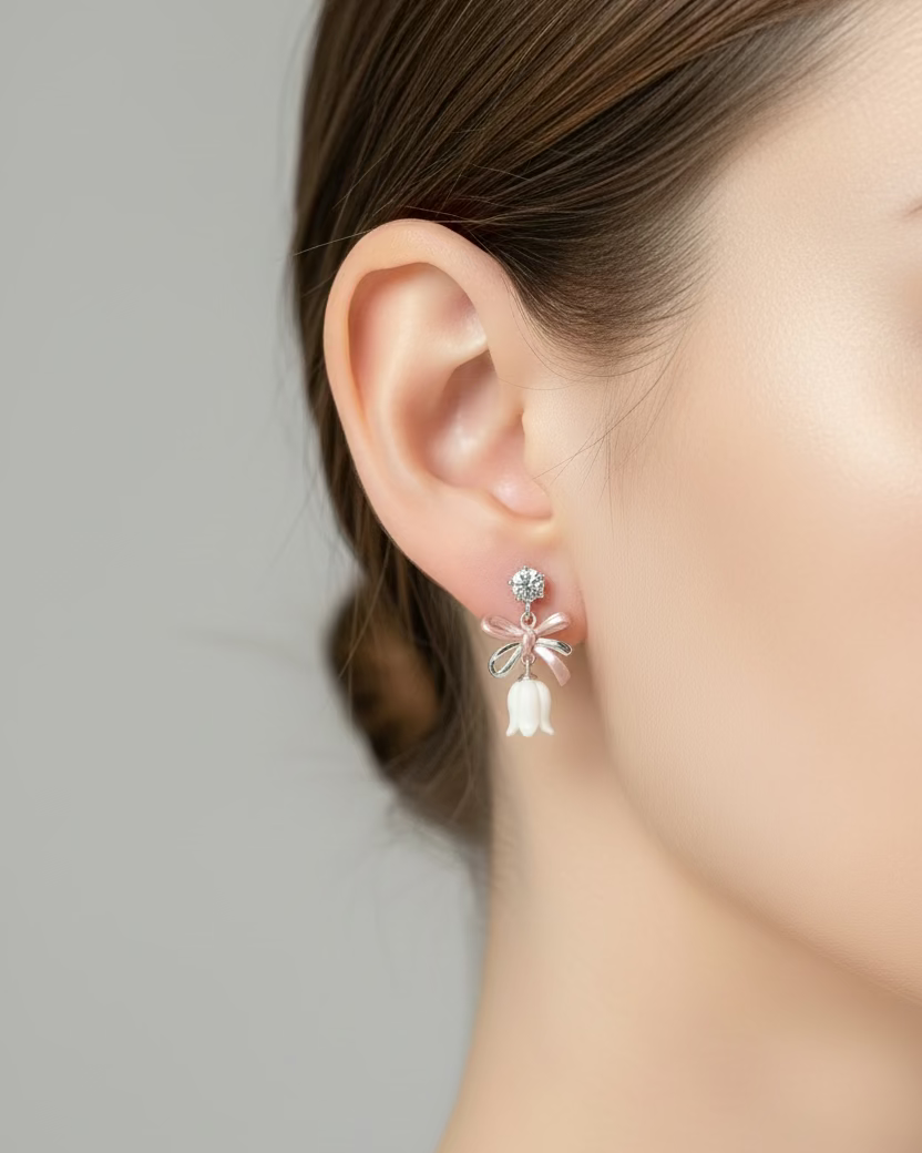Delicate mismatch earrings featuring a charming pink bow on one side and a graceful tulip dangle on the other. Crafted with 14k coated silver hardware and sterling silver 925 studs, these earrings combine elegance with comfort. The hypoallergenic sterling silver studs make them ideal for sensitive skin, allowing you to wear them all day without irritation. Perfect for adding a playful, asymmetrical touch to any outfit.