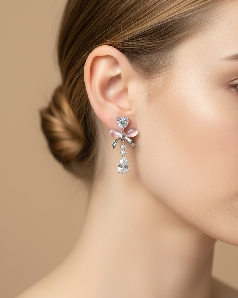 Elegant pink cateye bow earrings featuring a delicate heart dangle charm. Crafted with 14k gold-coated hardware and sterling silver 925 studs, these earrings combine style with comfort. The hypoallergenic sterling silver studs make them ideal for sensitive ears, allowing you to wear them all day without irritation. Perfect for adding a touch of feminine charm to any outfit.