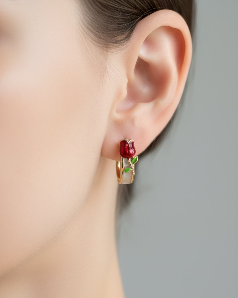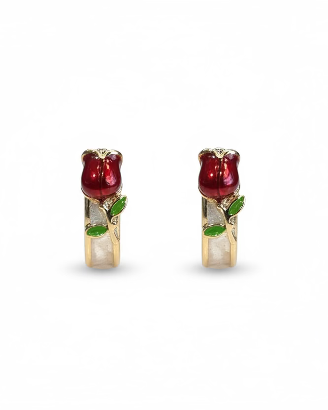Delicate red rose shimmery huggies crafted with 14k coated gold hardware and sterling silver 925 studs. The hypoallergenic design makes them ideal for sensitive skin, ensuring comfort throughout the day. These elegant earrings combine a subtle shimmer with timeless appeal, perfect for everyday wear or special occasions.